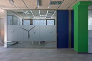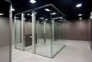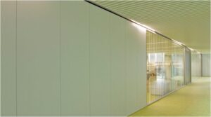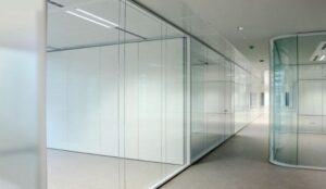 Los marcos de las puertas quedan ocultos (en el caso de particiones ciegas) o vistos (en el caso de vidrio).