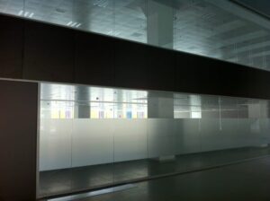 La partición PRIMACY permite la integración visual completa de las zonas de trabajo, aportando una atenuación acústica entre salas de hasta RW 50 dB, con la utilización de dos vidrios laminares de seguridad desde 3+3 hasta 8+8 mm.